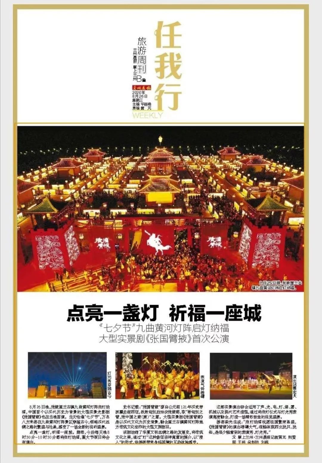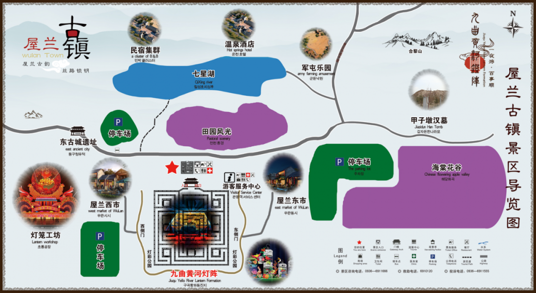 屋蘭古鎮景區既保留了絲綢之路開辟初期的漢代古城文化,更傳承了省級非物質文化遺產“九曲黃河燈陣”。2019年1月九曲黃河燈陣被上海大世界基尼斯記錄評為“中國規模最大的燈陣”。
